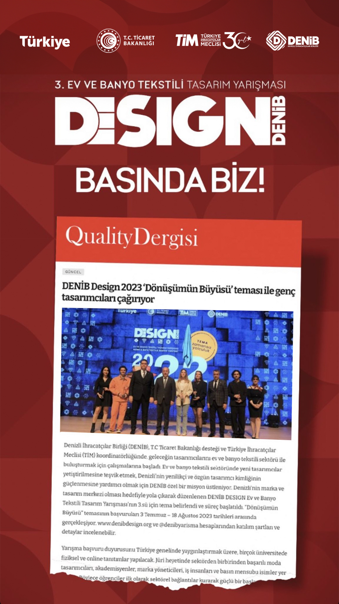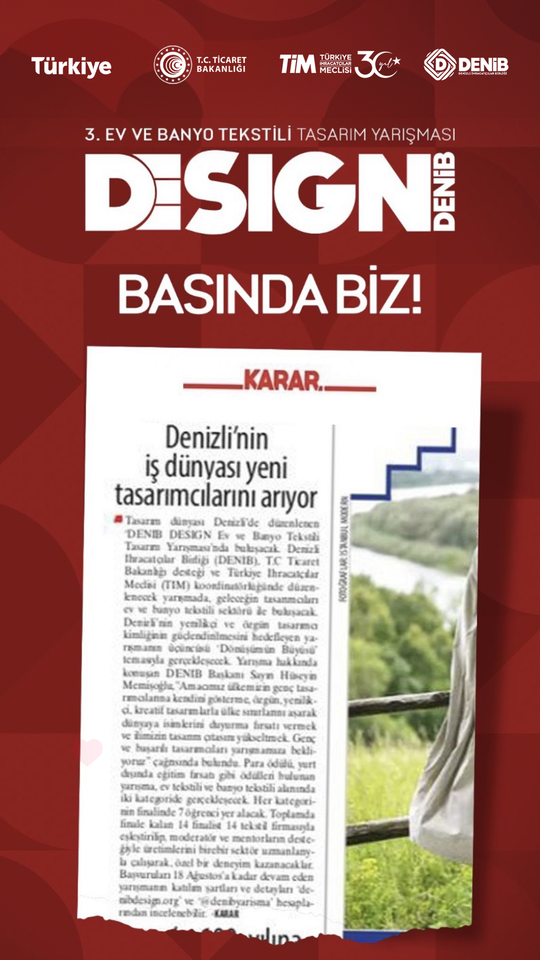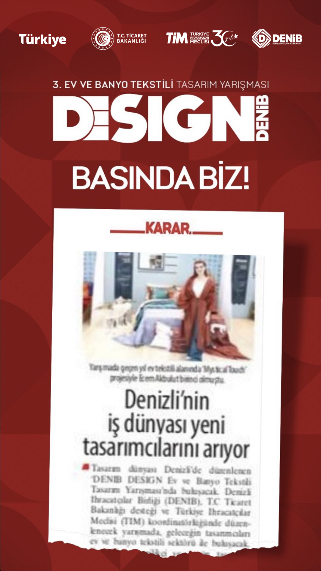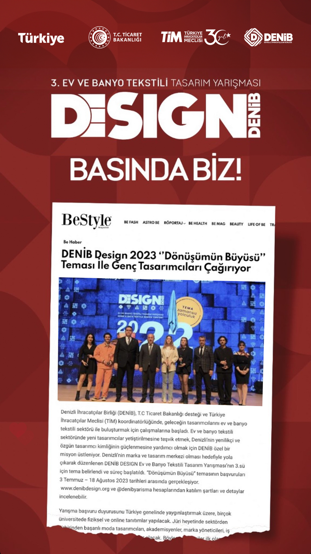 Denizli İhracatçılar Birliği (DENİB), T.C. Ticaret Bakanlığı desteği ve Türkiye İhracatçılar Meclisi (TİM) koordinatörlüğünde, geleceğin tasarımcılarını ev ve banyo tekstili sektörü ile buluşturmak için çalışmalarına başladı. Ev ve banyo tekstili sektöründe yeni tasarımcılar yetiştirilmesine teşvik etmek, Denizli’nin yenilikçi ve özgün tasarımcı kimliğinin güçlenmesine yardımcı olmak için DENİB özel bir misyon üstleniyor. Denizli’nin marka ve tasarım merkezi olması hedefiyle yola çıkarak düzenlenen DENİB DESIGN Ev ve Banyo Tekstili Tasarım Yarışması’nın 3.sü için süreç başlatıldı. “Dönüşümün Büyüsü” temasının başvuruları 3 Temmuz – 18 Ağustos 2O23 tarihleri arasında gerçekleşiyor. www.denibdesign.org ve @denibyarisma hesaplarından katılım şartları ve detaylar incelenebilir. Yarışma jüri heyetinde sektörden birbirinden başarılı moda tasarımcıları, akademisyenler, marka yöneticileri, iş insanları ve basın mensubu isimler yer alacak. Böylece öğrenciler ilk olarak sektörel bağlantılar kurarak güçlü bir başlangıç yapma fırsatı bulacaklar.