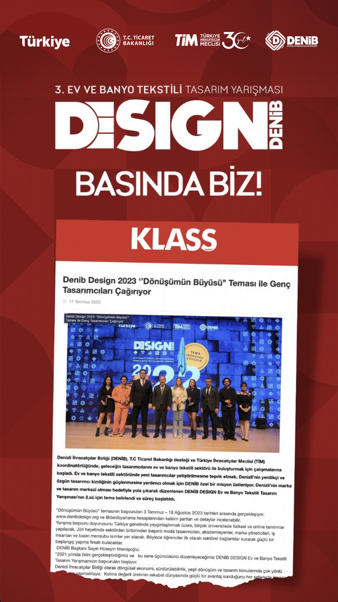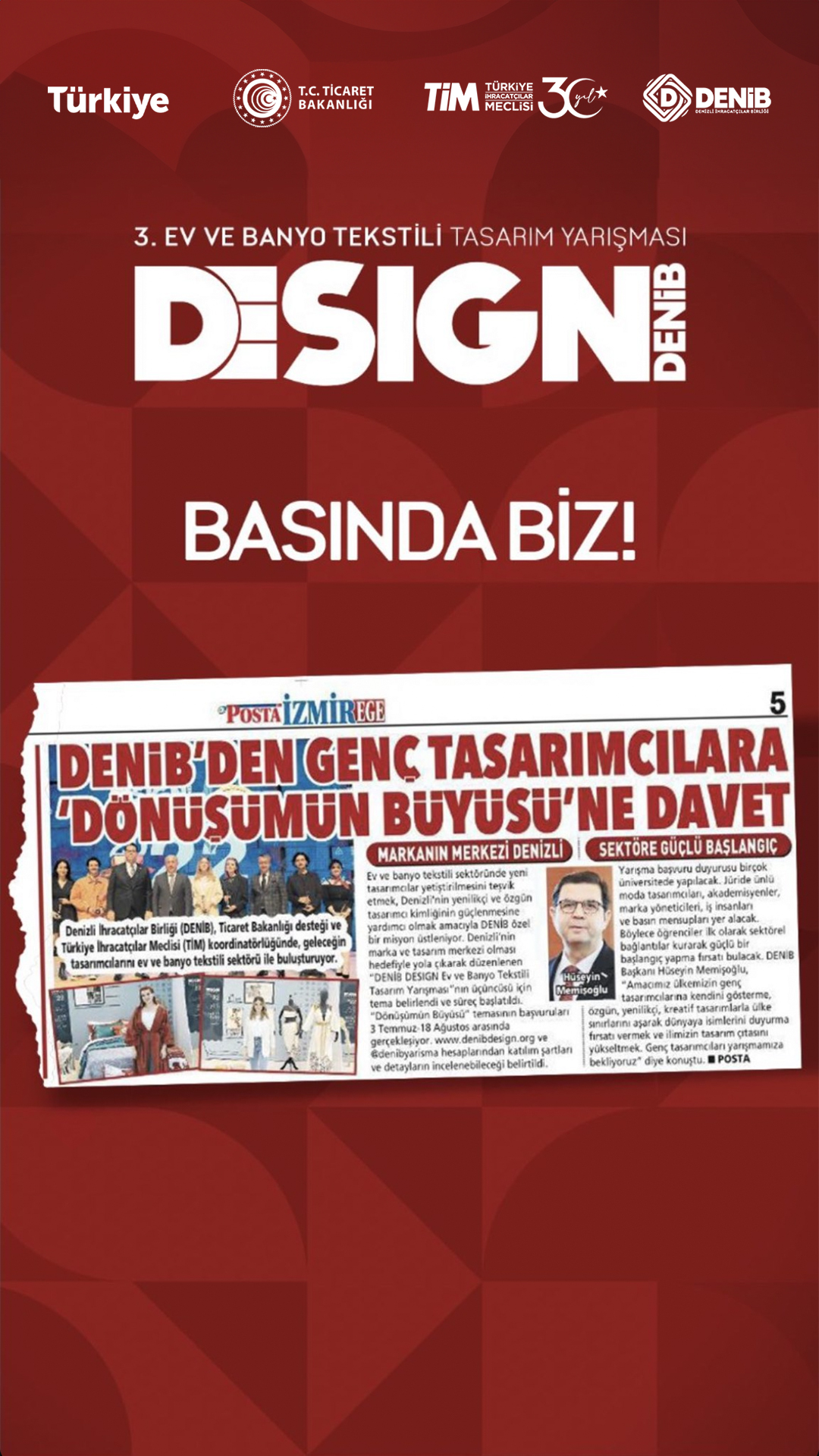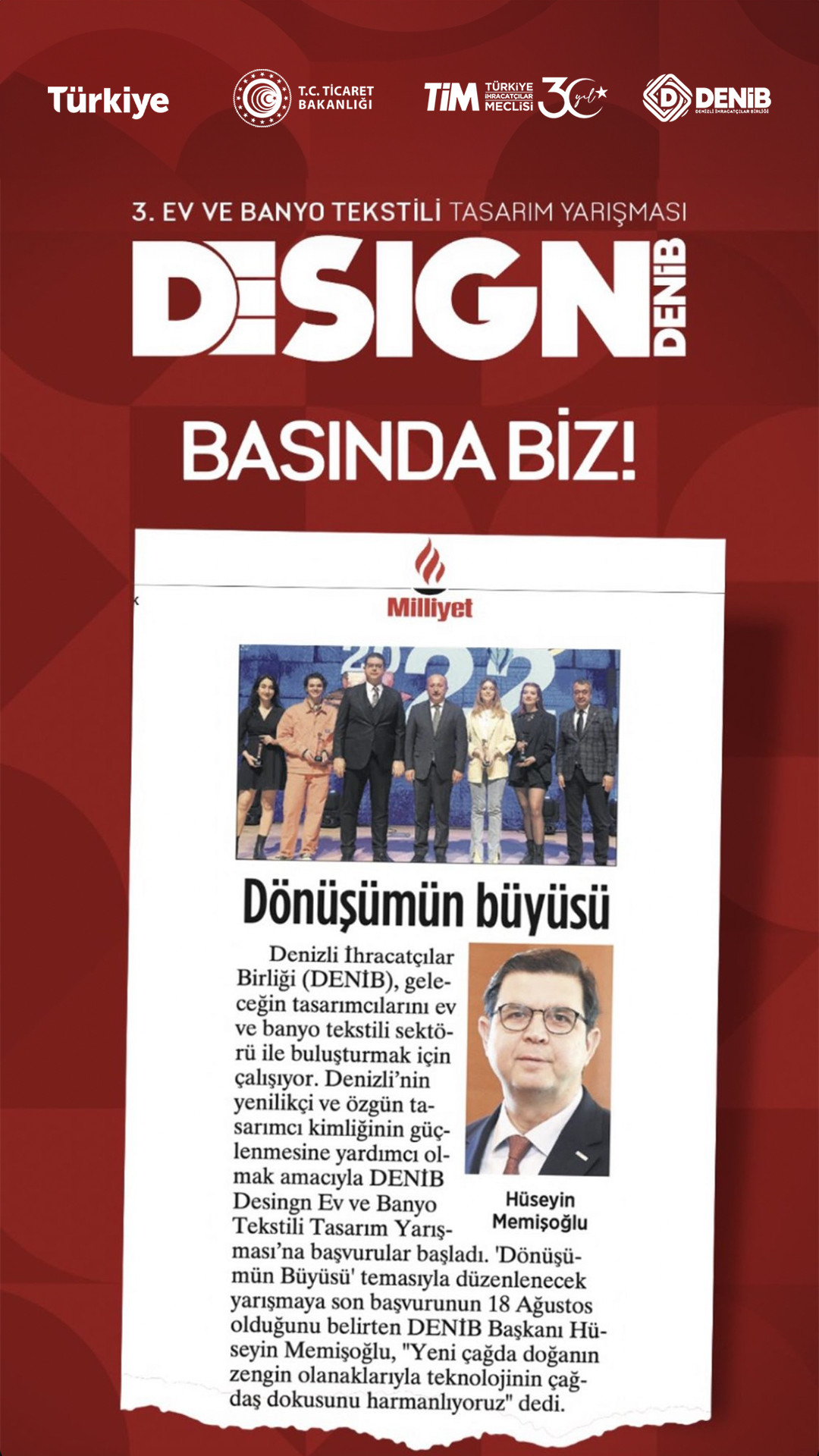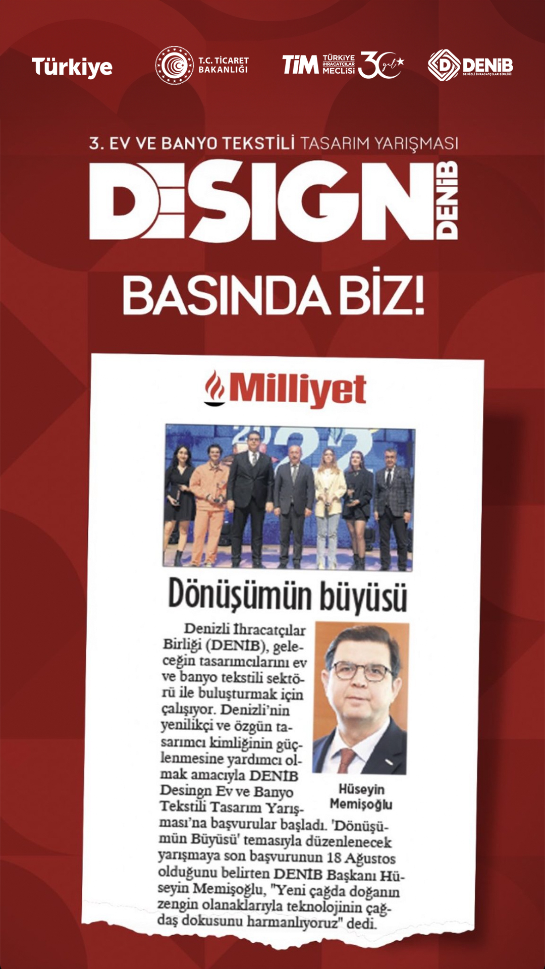 Denizli İhracatçılar Birliği (DENİB), T.C. Ticaret Bakanlığı desteği ve Türkiye İhracatçılar Meclisi (TİM) koordinatörlüğünde, geleceğin tasarımcılarını ev ve banyo tekstili sektörü ile buluşturmak için çalışmalarına başladı. Ev ve banyo tekstili sektöründe yeni tasarımcılar yetiştirilmesine teşvik etmek, Denizli’nin yenilikçi ve özgün tasarımcı kimliğinin güçlenmesine yardımcı olmak için DENİB özel bir misyon üstleniyor. Denizli’nin marka ve tasarım merkezi olması hedefiyle yola çıkarak düzenlenen DENİB DESIGN Ev ve Banyo Tekstili Tasarım Yarışması’nın 3.sü için süreç başlatıldı. “Dönüşümün Büyüsü” temasının başvuruları 3 Temmuz – 18 Ağustos 2O23 tarihleri arasında gerçekleşiyor. www.denibdesign.org ve @denibyarisma hesaplarından katılım şartları ve detaylar incelenebilir. Yarışma jüri heyetinde sektörden birbirinden başarılı moda tasarımcıları, akademisyenler, marka yöneticileri, iş insanları ve basın mensubu isimler yer alacak. Böylece öğrenciler ilk olarak sektörel bağlantılar kurarak güçlü bir başlangıç yapma fırsatı bulacaklar.