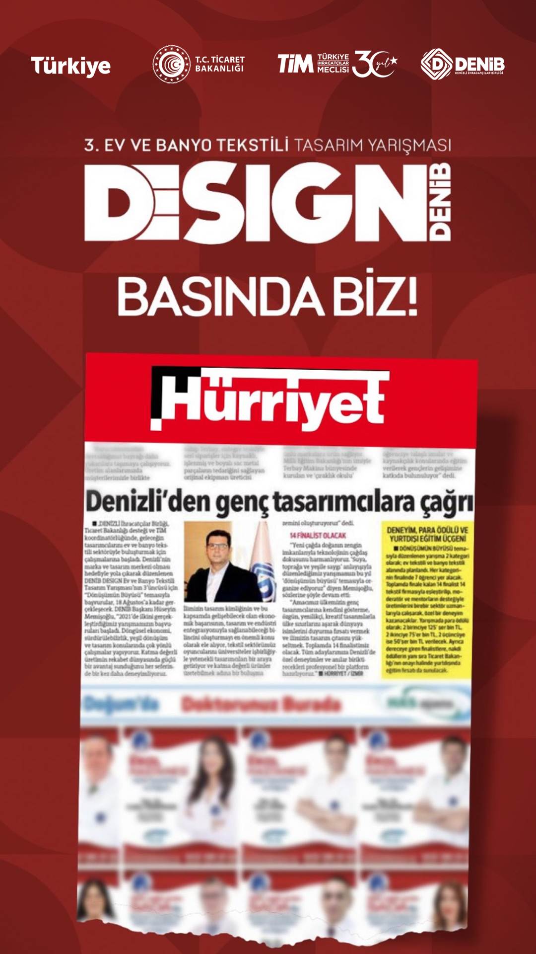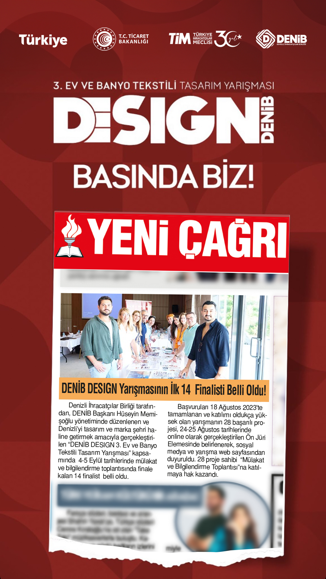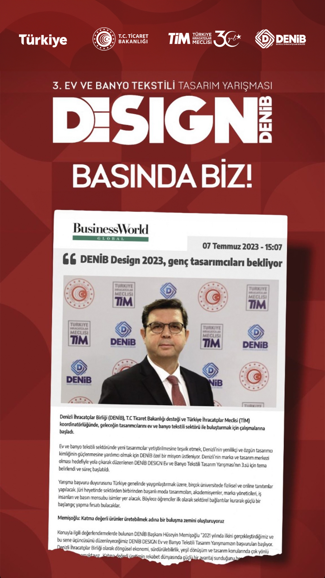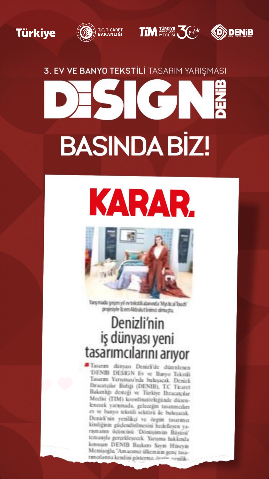 Denizli İhracatçılar Birliği (DENİB), T.C. Ticaret Bakanlığı desteği ve Türkiye İhracatçılar Meclisi (TİM) koordinatörlüğünde, geleceğin tasarımcılarını ev ve banyo tekstili sektörü ile buluşturmak için çalışmalarına başladı. Ev ve banyo tekstili sektöründe yeni tasarımcılar yetiştirilmesine teşvik etmek, Denizli’nin yenilikçi ve özgün tasarımcı kimliğinin güçlenmesine yardımcı olmak için DENİB özel bir misyon üstleniyor. Denizli’nin marka ve tasarım merkezi olması hedefiyle yola çıkarak düzenlenen DENİB DESIGN Ev ve Banyo Tekstili Tasarım Yarışması’nın 3.sü için süreç başlatıldı. “Dönüşümün Büyüsü” temasının başvuruları 3 Temmuz – 18 Ağustos 2O23 tarihleri arasında gerçekleşiyor. www.denibdesign.org ve @denibyarisma hesaplarından katılım şartları ve detaylar incelenebilir. Yarışma jüri heyetinde sektörden birbirinden başarılı moda tasarımcıları, akademisyenler, marka yöneticileri, iş insanları ve basın mensubu isimler yer alacak. Böylece öğrenciler ilk olarak sektörel bağlantılar kurarak güçlü bir başlangıç yapma fırsatı bulacaklar.